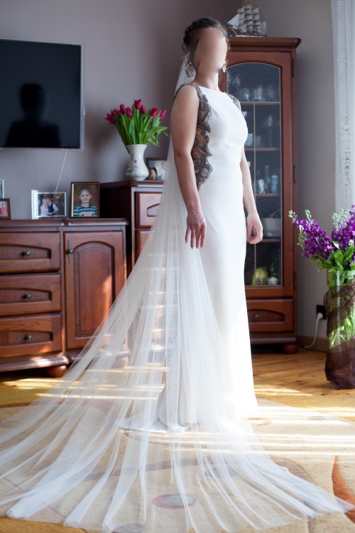 Do sukni chętnie dorzucę długi katedralny welon z jedwabiu, który dopełnia całości (widoczny na zdjęciu).
