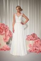 Muślinowy materiał, gładki dół, brak koła optycznie wysmuklają oraz sprawiają, że suknia jest wygodna, lekka i niesamowicie romantyczna.