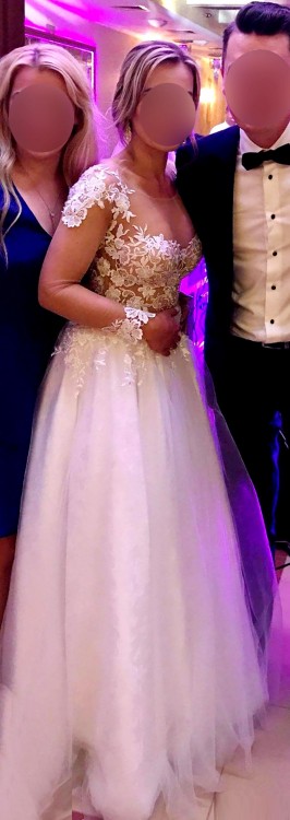 Góra sukni wykonana jest z modnych koronkowych aplikacji kwiatowych naszytych na cielistą siateczkę, dół natomiast składa się z 2 warstw tiulu przykrywających żakardową spódnicę w delikatne kwiaty. Talia podkreślona jest satynowym paskiem, na który naszyty został dodatkowo paseczek z koralików. Suknia posiada wszyte miseczki push-up. Została również nieco zmodyfikowana w stosunku do oryginalnego modelu poprzez doszycie cielistych rękawków z koronkowymi aplikacjami.