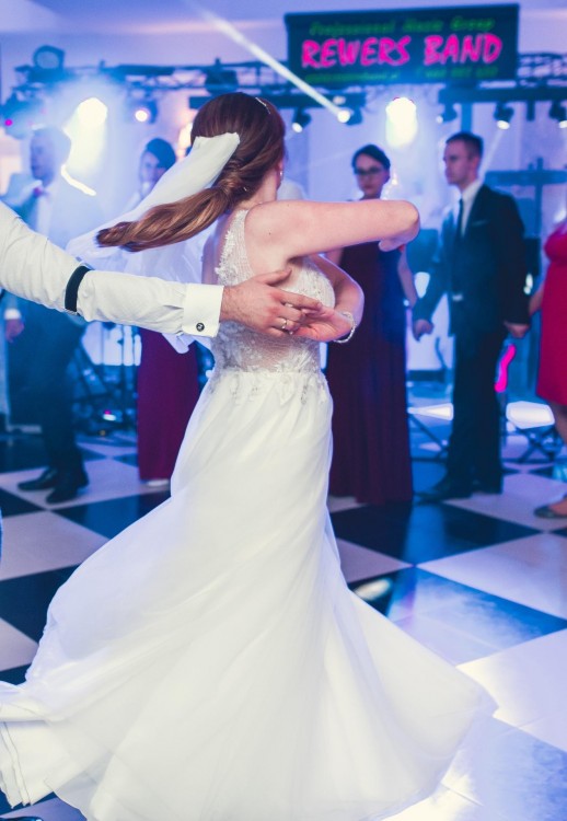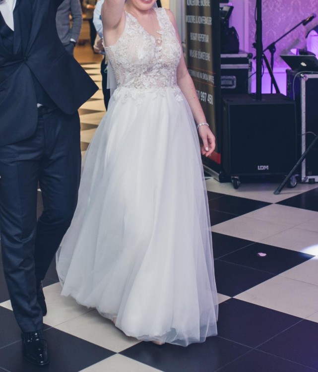 Koronkowa góra sukni uszyta z jasnego, lekko połyskującego materiału pięknie rozświetla TWARZ i ciało. Po prawej stronie znajduje się rozporek sięgający do połowy uda. Suknia jest lekka, świetnie się w niej tańczy, a dzięki rozporkowi pięknie układa się w tańcu i do zdjęć.