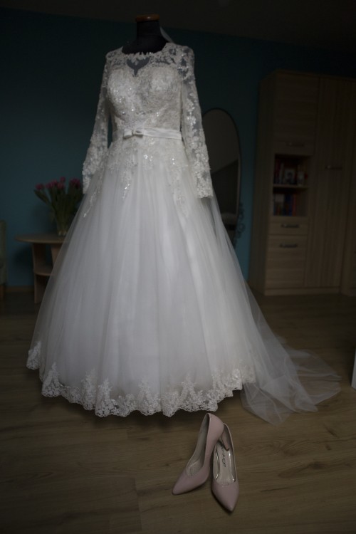Suknia śmietankowa w rozmiarze "małe" 40, maksymalnie na wzrost 175 cm (moja opcja to 166 cm plus szpilka 9 cm). Do sukni doszyte zostały koronkowe rękawy. Wykończona z przodu i z tyłu perełkami w odcieniu bladego różu.