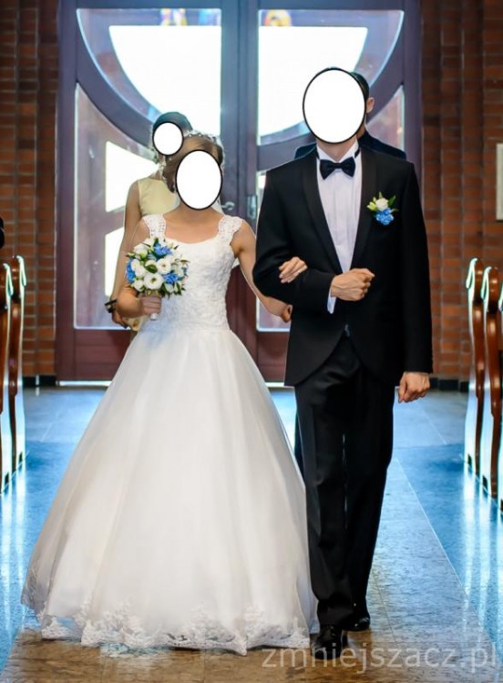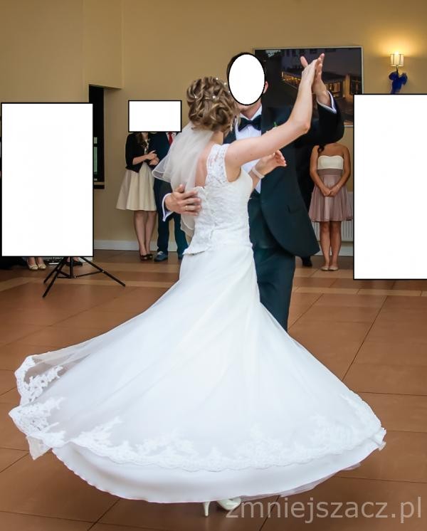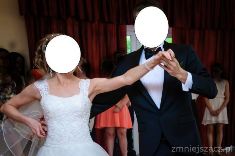 Do sukni jest także niedługi i delikatny tren przypinany na guzik - nie przeszkadza w trakcie tańca. W cenie jest także bolerko - zwykłe białe z krótki rękawkiem z połyskującego materiału, tak żeby komponował się z całością sukienki.