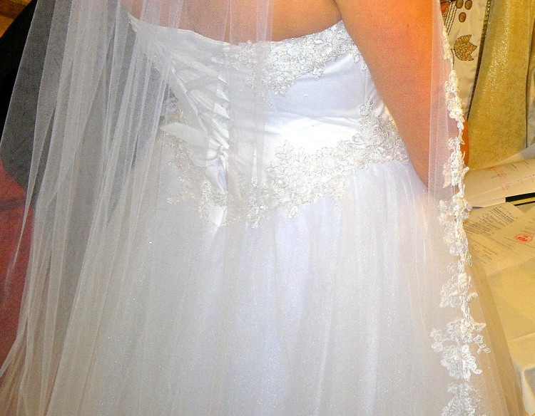 Ogólnie suknia prezentuje się stylowo. Jej dopełnieniem jest ok. 2,5m welon, tzw. katedralny, obszyty koronkowymi motywami kwiatowymi z błyszczącymi koralikami, który dodaję GRATIS. Razem tworzą spektakularny efekt.