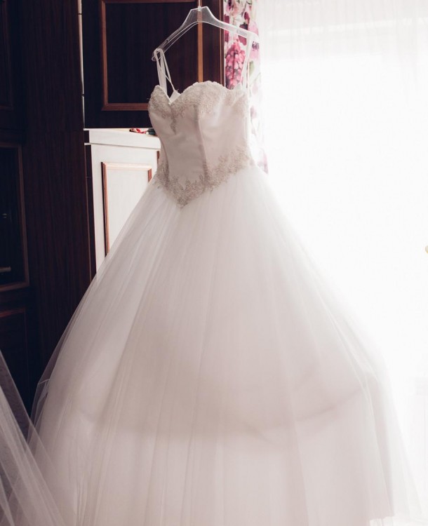 Suknia wraz z welonem została profesjonalnie wyczyszczona i odprasowana.