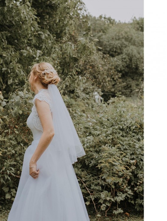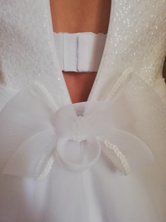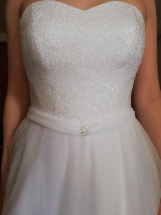 Krój: litera A/princess, lub węższa (bez koła). Ma 6 warstw tiulu i wszytą halkę.