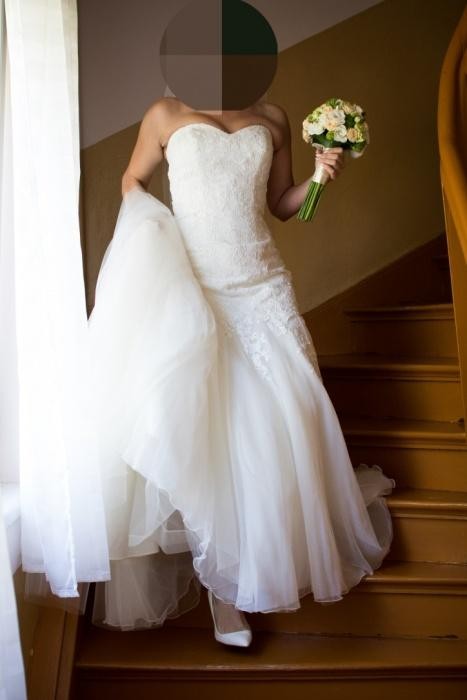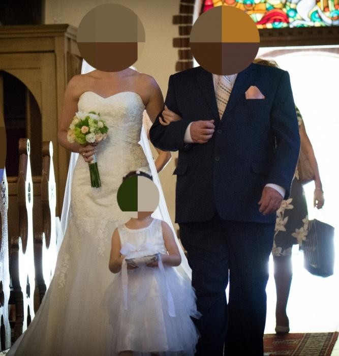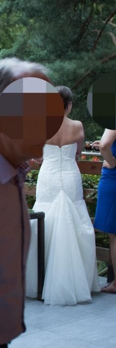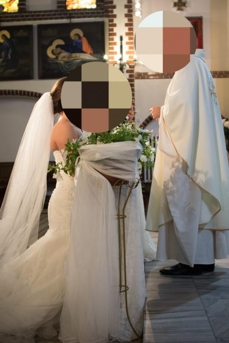 Suknia była dopasowana na wzrost 167 cm + 11cm obcas. Wymiary 96/74/100. Bardzo wygodna w tańcu, trzyma się na swoim miejscu dzieki dodatkowej taśmie w pasie. Bardzo mocny zamek na plecach, zakryty stylowym guzikami. Do sukni dołączam welon ok 280 cm długości. Suknia będzie oddana przeze mnie do czyszczenia.