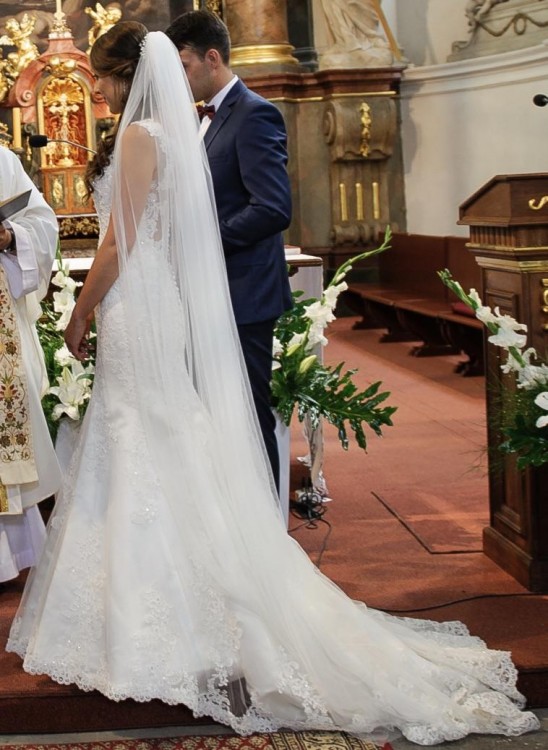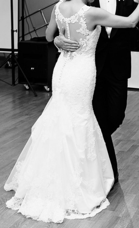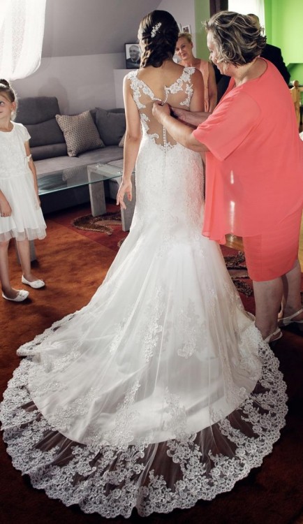 Suknia z efektownym trenem, przypinanym na dyskretny guzik, dół na kole, (opcja do wyboru). Bardzo wygodna! Na plecach głęboki dekolt, zabudowany dodatkowo delikatną siateczką i wykończony koronkową aplikacją na bokach. Suknia wykonana jest z materiałów wysokogatunkowych, lekkich, ale trzymających formę sukni, cechuje ją niesamowita elegancja oraz bogactwo zdobień.