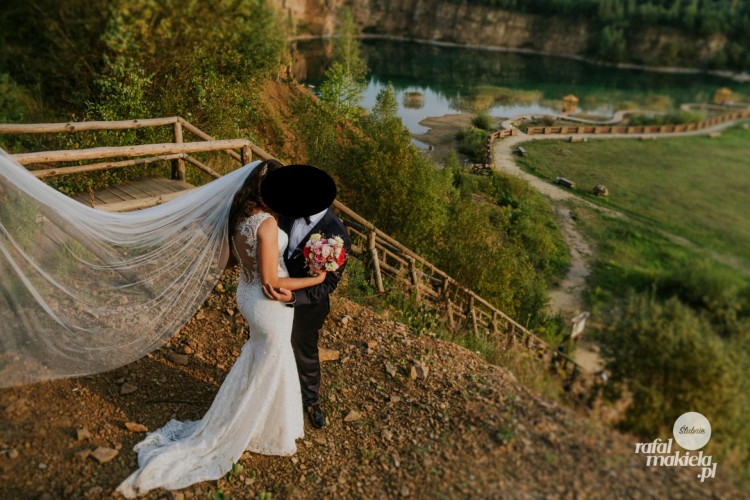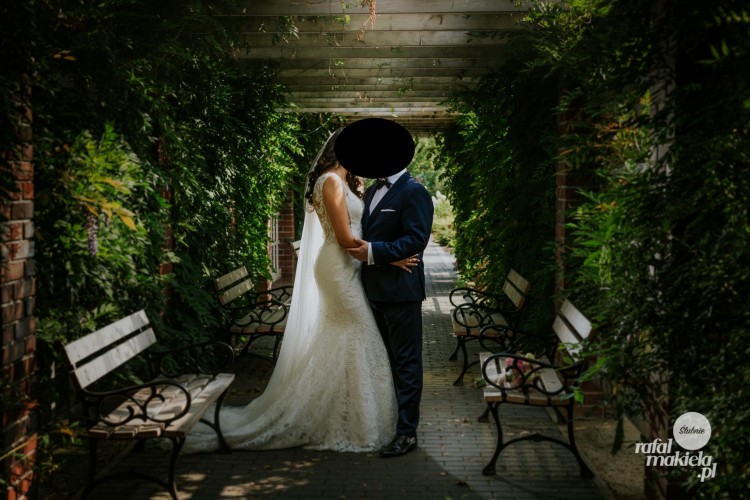 Suknia posiada tren, który można spiąć na przyszytych guziczkach oraz zostały wszyte miseczki push up.