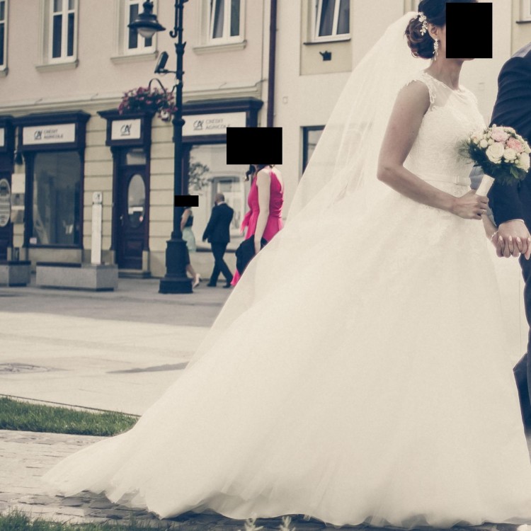 Suknia posiada piękny tren, który można łatwo podpiąć. Ślicznie prezentuje się z długim welonem.
