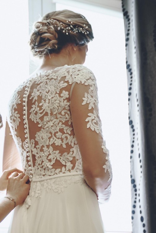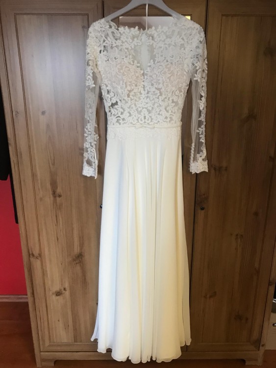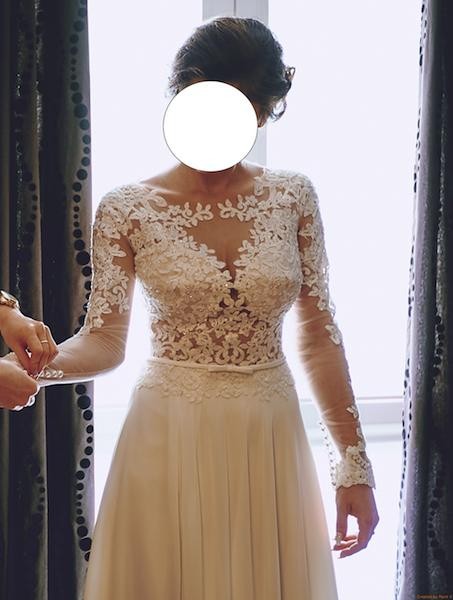 Góra z cieniutkiej przylegającej do ciała siateczki wyszytej aplikacjami z koronki, ozdobionej delikatnymi perełkami mieniącymi się w świetle. Dół zwiewny muślinowy na podszewce, posiada rozcięcie z prawej strony, co dodaje uroku całej sukni. Suknia ma dopinany tren oraz wszyty biustonosz/wkładki. Rękawki jaki i plecy sukni są zapinane na perełki z cyrkonią