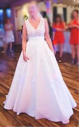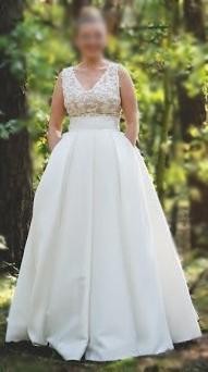 Sprzedam przepiękną suknię ślubną z Atelier Violi Piekut. Suknia szyta na miarę, dwuczęściowa w kolorze ecru. Bluzka - ręcznie wyszywane kwiaty a'la koronka, pod spodem delikatne, mieniące się małe cekiny. Bluzka na grube ramiączka, z przodu i z tyłu dekolt w literę V.
