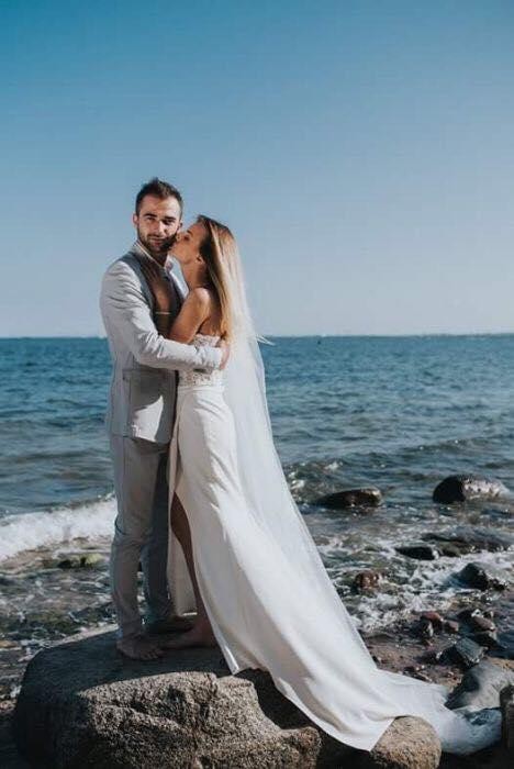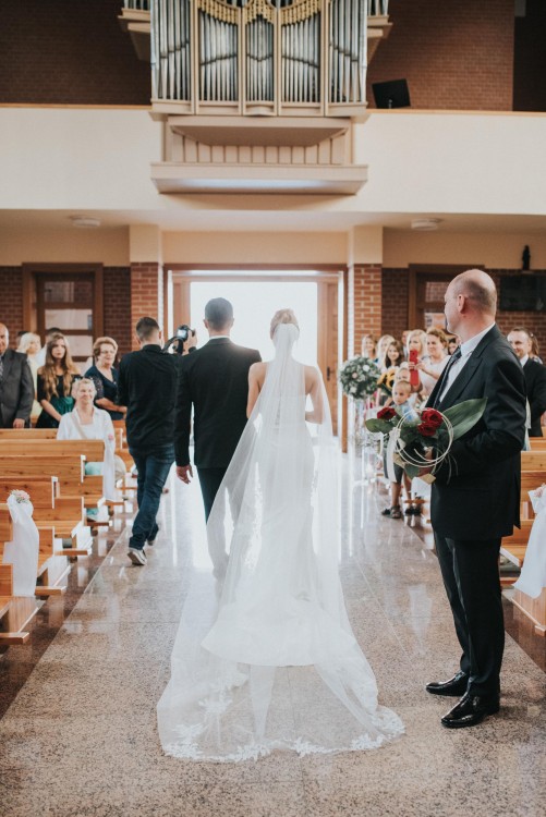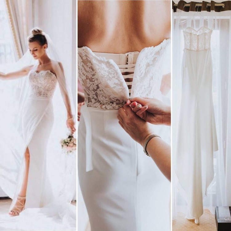 Suknia posiada długi tren , który pięknie się rozkłada ,natomiast można go podpiąć do srodka co umożliwia swobodne tańczenie .