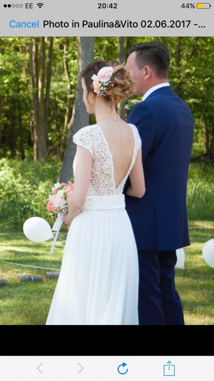 Suknia szyta na miarę 36/38 ale po stracie wagi krawcowa zmniejszyła ją na 34/36 czego w ogóle nie widać ! Oczywiście zmiany można zrobić ręcznie bez problemu , ponieważ to również było szyte ręcznie .