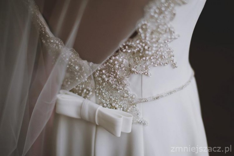 Tren znajdujący się przy sukni podwiązywany na ukrytych w środku sznureczkach.