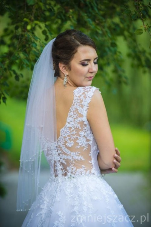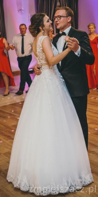 Góra to model 649 z kolekcji 2018 z białym materiałem pod koronką, cielistą siateczką i wszytymi miseczkami (rozmiar B, ale pasują też na większy biust). Posiada pięknie wycięte plecy, które jednak doskonale przytrzymują górę sukni. Dół to model 701 z kolekcji 2018. Składa się z kilki warstw, z czego 3 warstwa jest brokatowa, co daje efekt pięknego, delikatnego połysku. Całość wykończona koronką.
