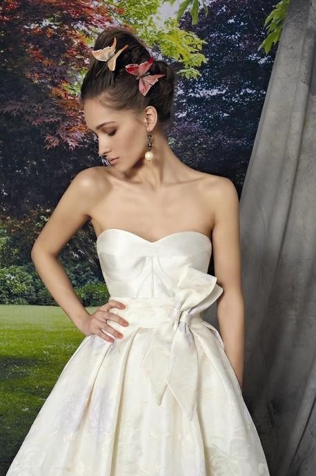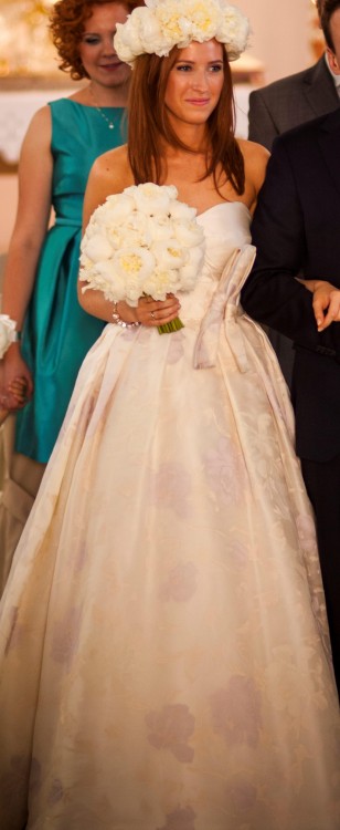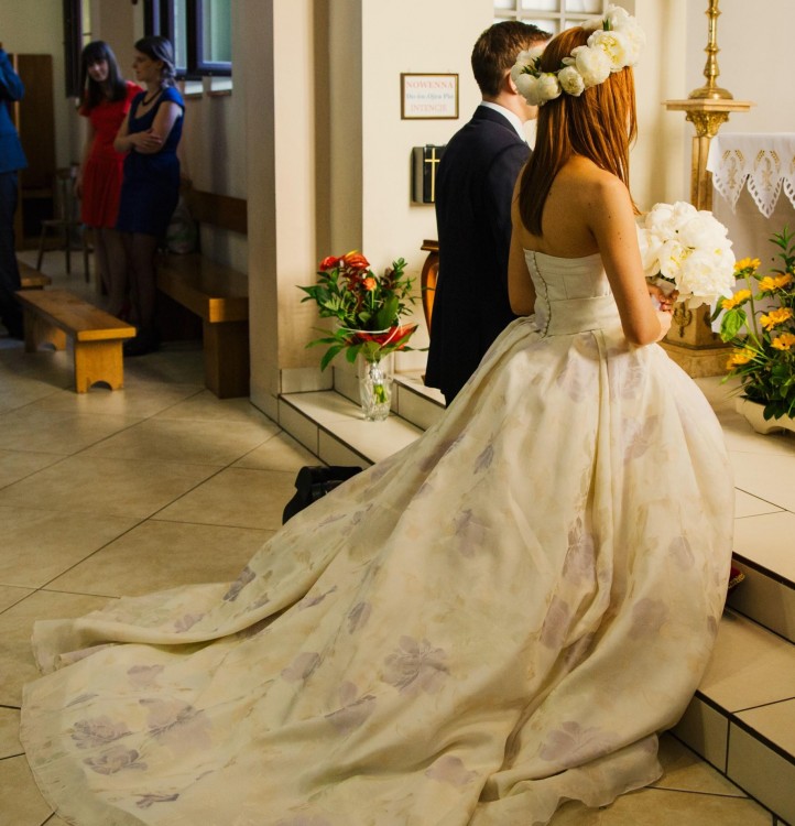 Przepiękna suknia ślubna hiszpańskiego projektanta Manu Garcia. Suknia w kolorze off-white delikatnie wpadającym w złoty odcień z cudownym subtelnym wzorem kwiatowym w odcieniach fioletu, różu. Suknia w rozmiarze szczupłe 36 na wzrost 167cm plus 7 cm obcas. Suknia ma własną podszewkę i formującą ją od spodu warstwę tiulu. Niewielki tren z możliwością podpięcia. Halka z niewielkim kołem gratis. Cena sklepowa 6000.