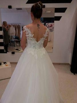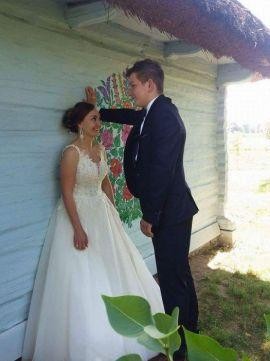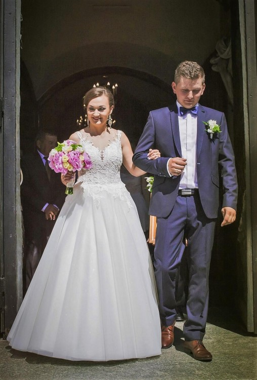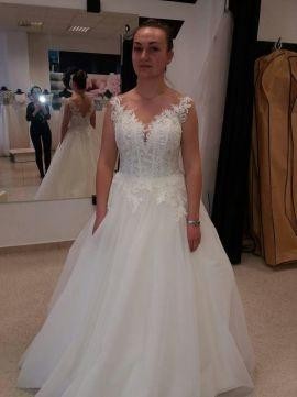 Sprzedam suknie ślubną Model 1708 z kolekcji Vanessa 2017, rozmiar 38 z metki M, suknia na zamek, kolor śmietankowy z brokatowym tiulem pięknie błyszczącym ( 5 warstw tiulu elastyczny, dobrze się układa + wszyta halka ) i koronką z weneckiej bawełny. Zmodyfikowana góra sukni według własnego projektu. Wzrost 162 cm plus 7 cm obcas. Obwód biustu 90, miseczka B, obwód nad biustem 85, obwód pod biustem 75, talia 71. Wyprana w pralni chemicznej. Suknia bardzo wygodna i efektowna. Cena do negocjacji. Zachęcam do przymiarki i gorąco polecam!