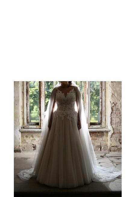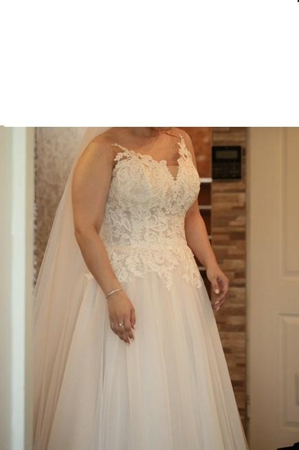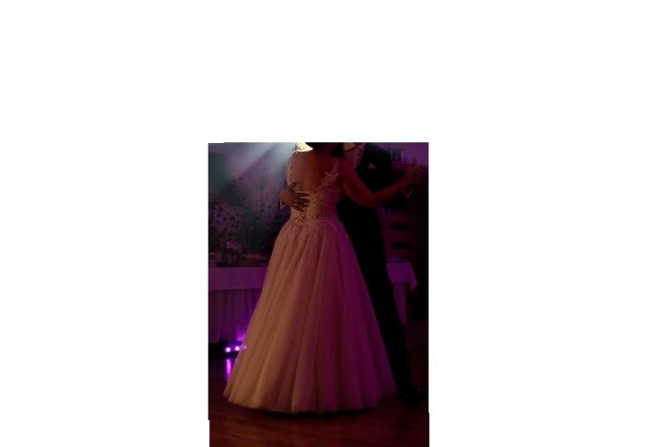Mam do sprzedania wyjątkową suknię ślubną w rozmiarze 40/42 kupioną w salonie Loretta we Wrocławiu w maju 2017 roku. Góra sukni zrobiona jest z cielistej siateczki z naszytymi elemenatmi w kolorze ecru. Tył sukni wiązany (co umożliwia idealne dopasowanie sukni). Dół sukni w odcieniu beżu/delikatnego różu w zależności od światła, delikatnie mieni się srebrnym brokatem. Suknia jak na suknię ślubną nie jest ciężka. Do sukni dołączam gratis koło na gumce (nie jest wszyte w sukni) oraz dwa welony - jeden jest krótki długość do pasa, drugi - długi z naszytymi elementami jak na sukni. Suknia była szyta na miarę, na wzrost 162 cm + około 8 cm na obcas.
