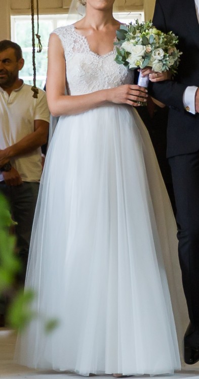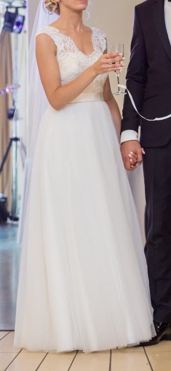 Suknia ślubna w rozmiarze 36/38 w kolorze śmietankowej bieli (ivory), szyta na wzrost 165 cm + 7 cm buty.