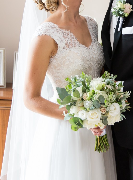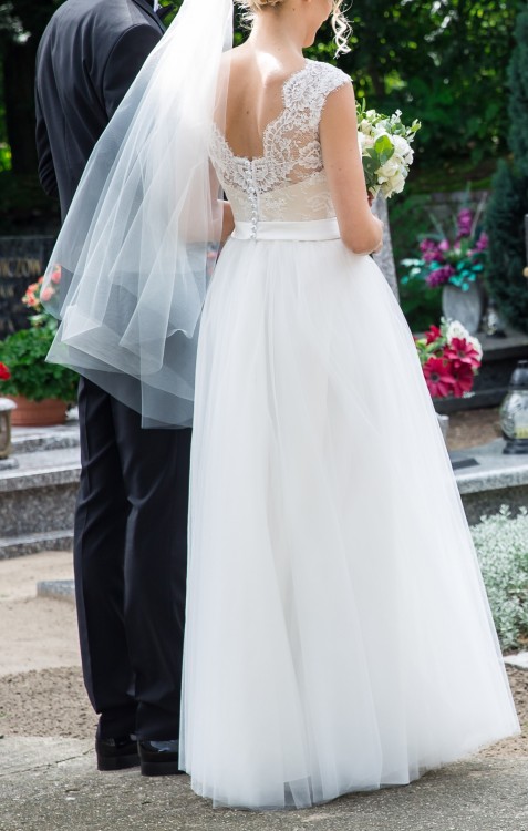 Dekolt w kształcie litery V z przodu i z tyłu sukni, ramiona delikatnie zakryte poprzez wykończenie koronki.