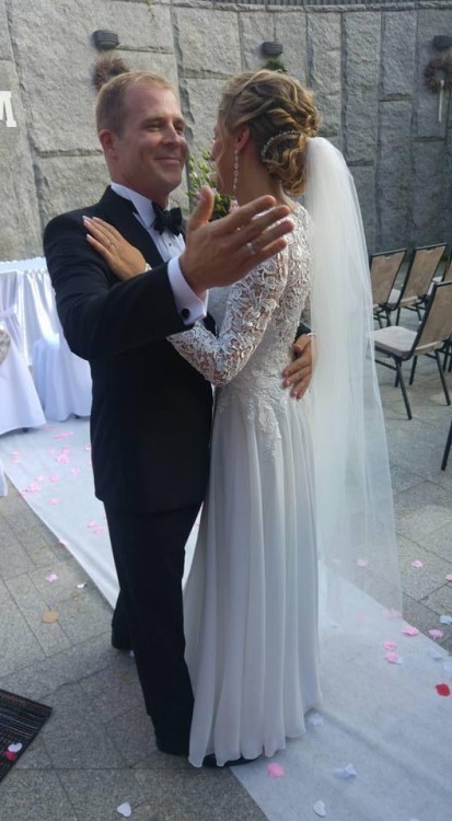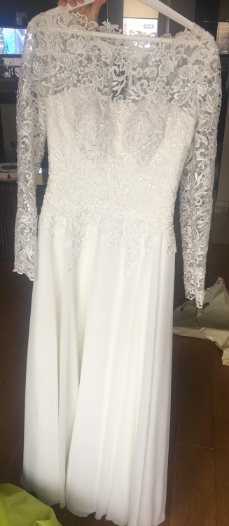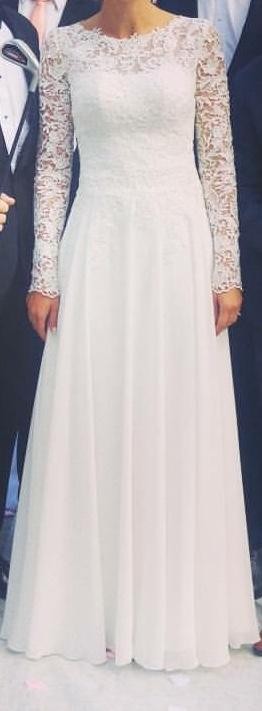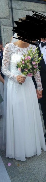 Suknia ślubna w stanie idealnym po czyszczeniu. Szyta na miarę. Gorset profilowany miseczka „b” pokryty koronką z przedłużonym rękawem.