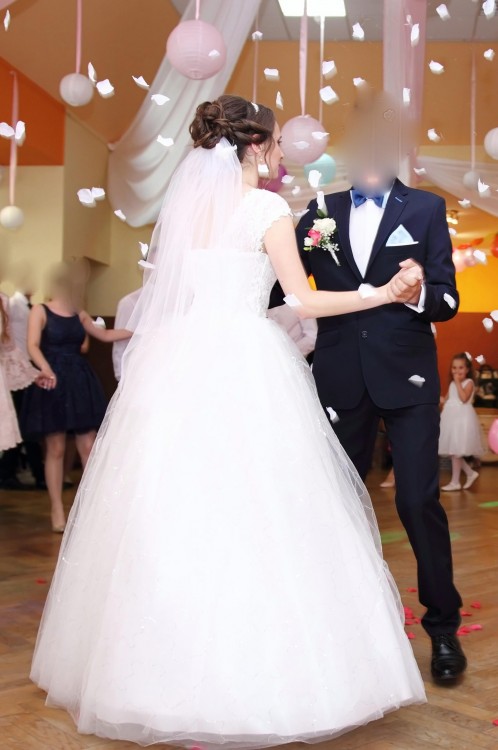 Suknia ślubna wykonana z tiulu i koronki, dekolt obszyty gipiurowymi kwiatkami, krótki rękawek. W pasie piękna kryształowa ozdoba, z tyłu regulacja wiązaniem, dół tiulowy z delikatnie przebijającymi spod spodniej warstwy cekinami.