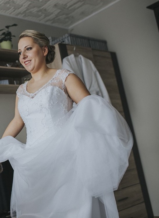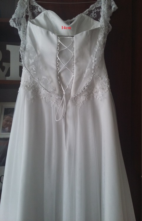 Posiada zdobienia jak na zdjęciu, jest możliwość przerabiania sukienki, odszycia elementów przy biodrach. Suknia jest gorsetowa, zakrywana guziczkami tak żeby nie było widać wiązania. Sukienka nie posiada koła. Jest lekka i pięknie wiruje w tańcu. W dwóch warstwach są malutkie dziureczki których nie widać, nie zostały one zaszyte tak żeby kolejna Panna młoda mogła zadecydować co z nimi zrobi, dziurki są przy samej ziemi więc jak ktoś będzie skracał to i tak je obetnie. Są trzy warstwy i podszewka.