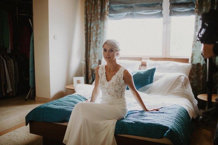 Suknia ślubna według własnego projektu,w kolorze ivory,wycięte plecy, podpinany tren, delikatna,zwiewna i kobieca.