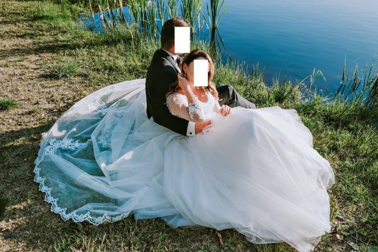 Sprzedam suknię ślubną własnego projektu w rozmiarze 36, wzrost 158 cm + obcas 10 cm.