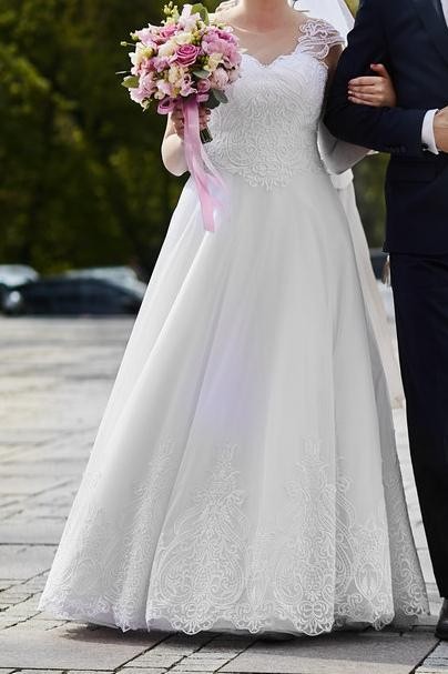 Suknia ślubna w bieli, model Nilika, zakupiony w Bydgoszczy w Salonie sukien slubnych Emily. Wyprana, wykrochmalona. Stan idealny.