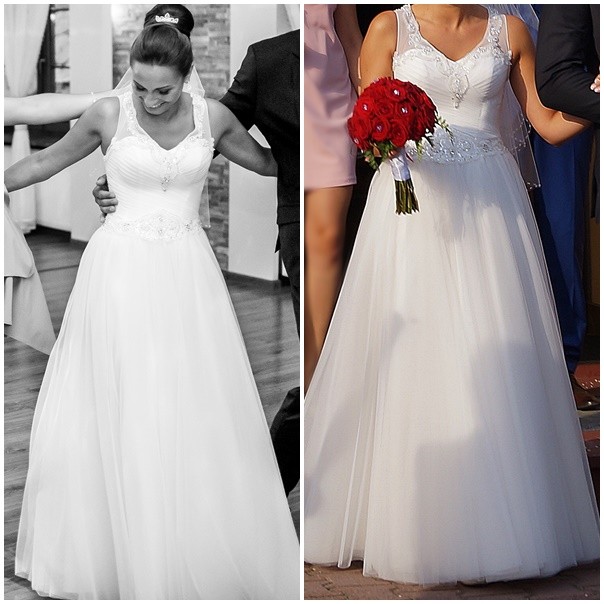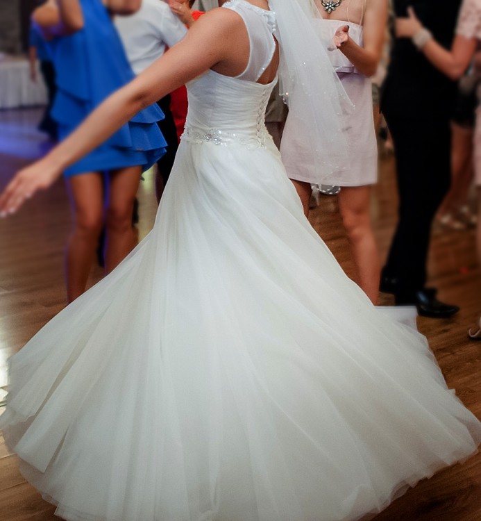 Góra sukni od przodu i tyłu wysadzana jest połyskującymi kamieniami. Suknia nie posiada koła co jest bardzo komfortowe w noszeniu, ma jednak kilka warstw tiulów, co powoduje piękne naturalne rozkloszowanie.Miseczki są usztywniane, najlepiej będzie się prezentować na miseczce b-c. Używana jeden raz, nie posiada żadnych uszkodzeń. Suknia jest wyprana i wyprasowana, wygląda jak nowa.