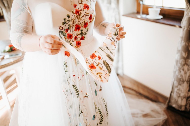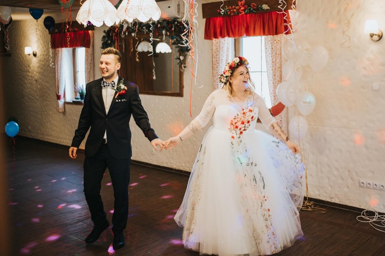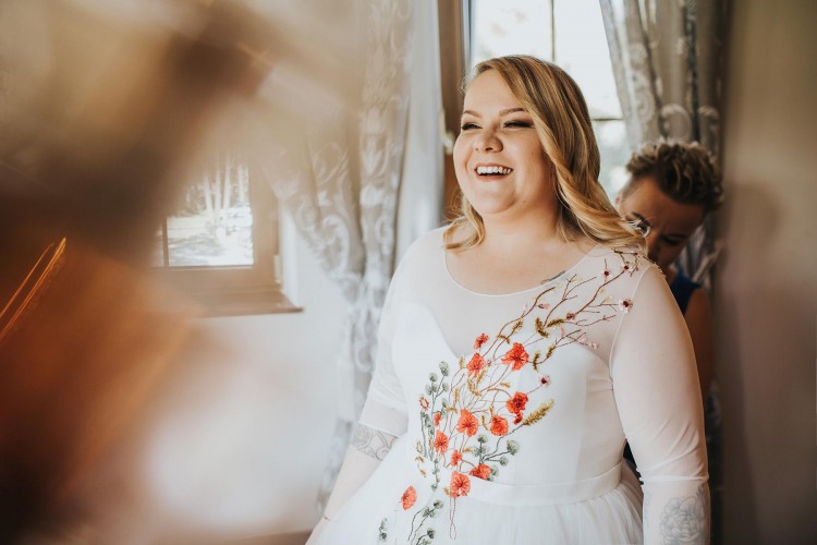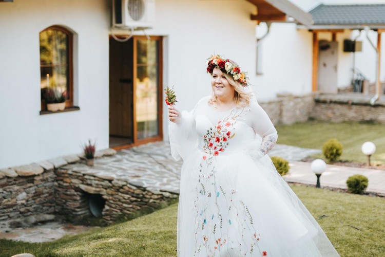 Suknia ślubna plus size. Suknia autorskiego projektu w haftowane kwiaty w kolorze przełamanej bieli.