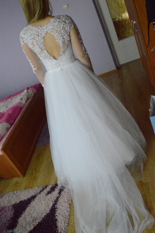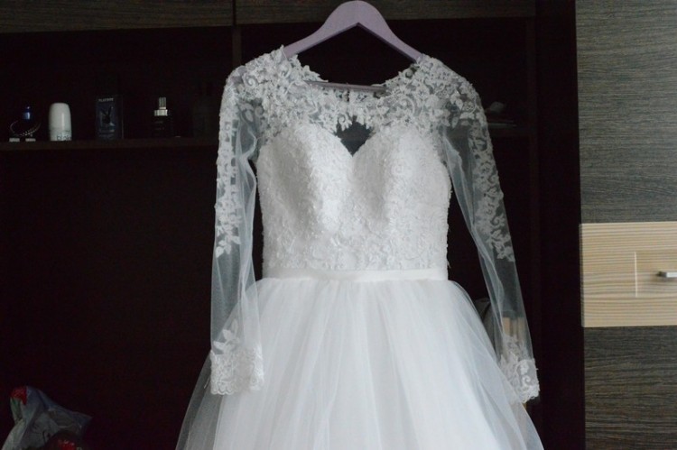 Witam. sprzedam suknie ślubną w rozmiarze xs. Suknia byla szyta w salonie estera na wzrost 157 plus szpilki około 8 cm . Posiada długi rękaw wyszyty koronką oraz wyciętą ,,łezkę'' na plecach. Dół sukni wykonany jest z tiulu lejącego ,z tyłu suknia posiada tren , który zapinany jest na guzik przy sukni . Suknia posiada koło , które mozna samemu wyciągnąć . Więcej informacji szczegółowych i zdjęć zainteresowanym podam na priv. Cena salonowa wraz z welonem 2750 zł.