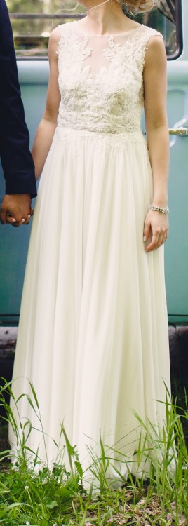 Suknia jest wygodna, pięknie się układa na ciele i w ruchu. Nie jest uszkodzona. Miałam ją na sobie 2 razy (w dzień ślubu oraz na plener). Po ślubie była prana, po plenerze nie, więc trzeba jej zafundować czyszczenie.