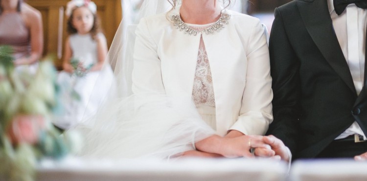 Zjawiskowa suknia ślubna w komplecie z żakietem i ozdobą do włosów.
