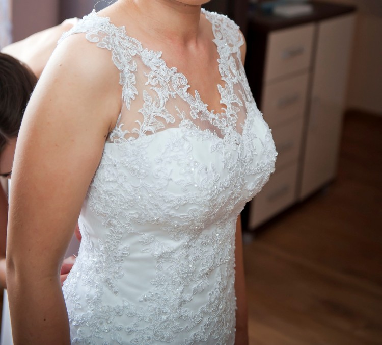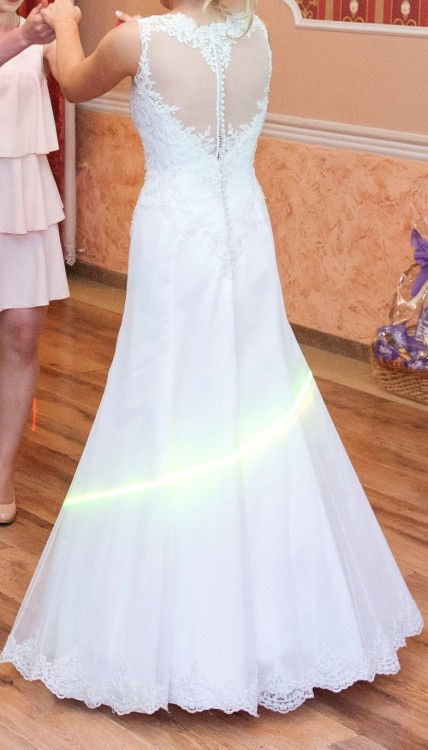 Suknia jest śnieżnobiała, założona tylko jeden raz, wyczyszczona, bez uszkodzeń.