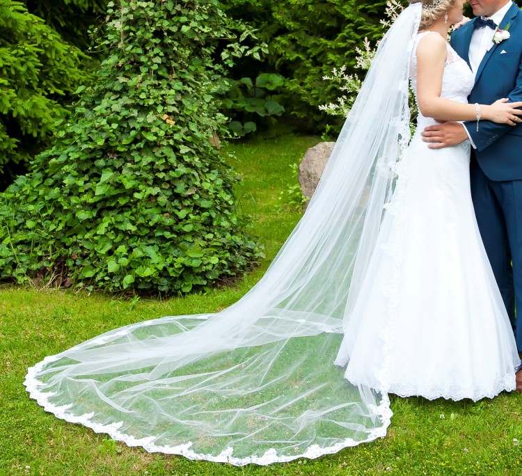 Do sukni dołączam halkę z kołem, krótki welon obszyty koronką oraz długi 2,5 m welon również obszyty koronką.