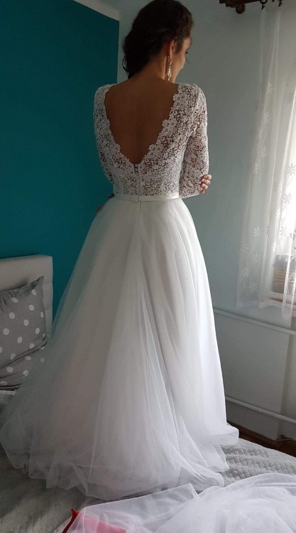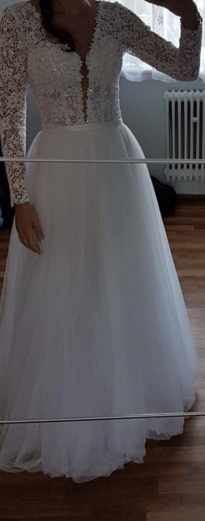 Była szyta na rozmiar 34, 176 cm + 8 cm obcas. Suknię można bez problemu skrócić. Kolor biały. Suknia jak najbardziej "na czasie". Prawdopodobnie nie ma drugiej identycznej ponieważ wprowadzono w modelu kilka istotnych zmian. Suknia ma górę z gipiury ale bardzo wygodnej i dość cienkiej oraz tiulowy dół ( jedna warstwa satynowej podszewki i 6 warstw tiulu), jest bardzo zwiewna i pięknie układa się przy każdym ruchu. Długi rękaw nie krępuje ruchów, jest bardzo wygodny i nie powoduje uczucia gorąca. Suknia posiada rozporek.