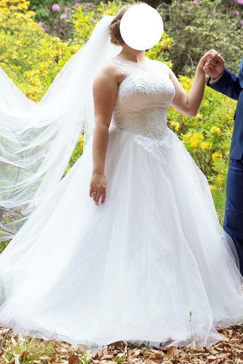 Suknia jest lekka i wygodna. Posiada halkę z kołem. Razem z suknią sprzedaję długi welon do kościoła oraz welon sięgający łokci.