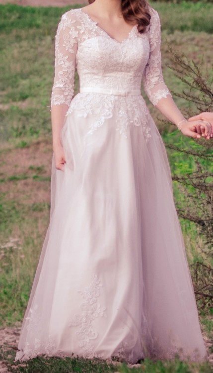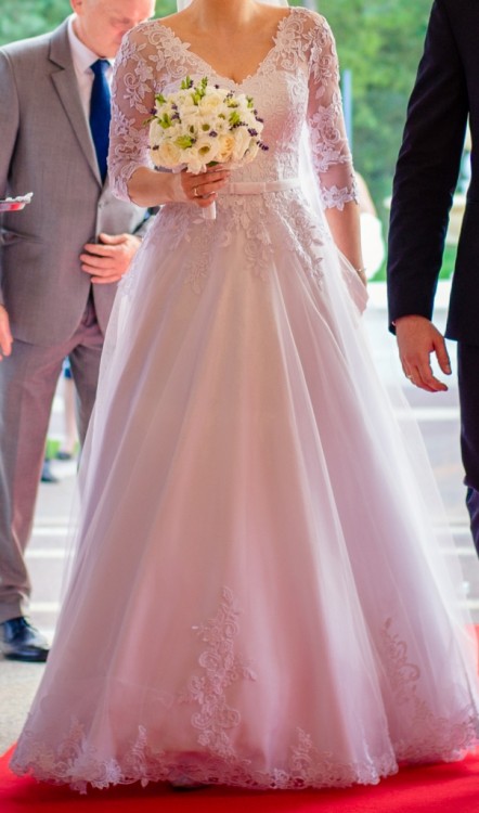 Biała suknia ślubna z delikatną tiulową spódnicą oraz rękawem 3/4 wykończona ręcznie oryginalną gipiurą. Wzrost 171 (+8cm obcas)