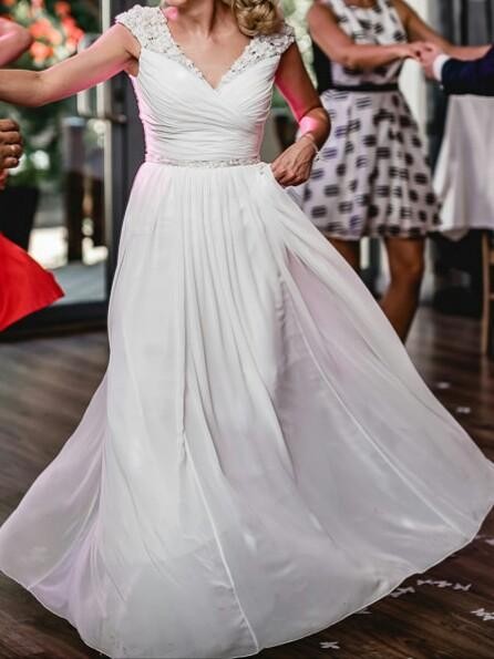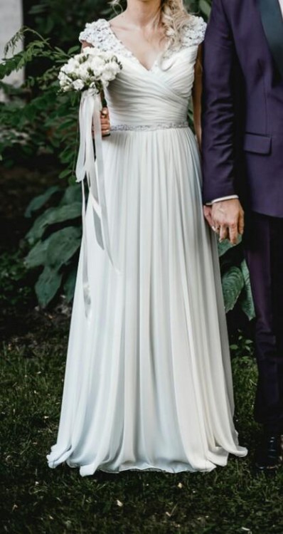 Suknia ślubna firmy Pronovias. Rozmiar 34. Kolor śmietankowy. Wymiary: biust ok 44/45 cm x2, pas ok. 33 cm x2, dł całkowita ok 144 cm. Szyta na 164 cm plus 7 cm obcas. Bez uszkodzeń. Po praniu chemicznym. Dorzucam halkę i pasek widoczny na zdjęciach. Suknia bardzo wygodna. Ramiona wyszywane koralikami i kryształkami (pasek również). Suknia ładnie układa się w tańcu. Świetnie się sprawdziła. Polecam gorąco.