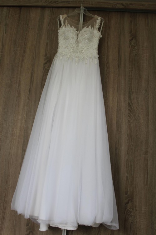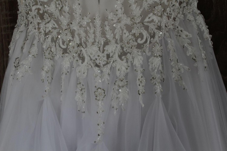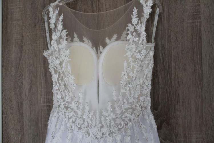 Suknia ślubna założona raz i od razu oddana do prania ręcznego. Suknia ślubna zaprojektowana do wzrostu 176 cm +9,5 cm obcas. Pochodzi z kolekcji ślubnej 2018/2019. Suknia łączy w sobie dwa modele: spódnica TO-739, koszulka: TO-743. Na koszulce zaprojektowane zostały dodatkowe aplikacje i dekolt powiększony o 5cm. Tył koszulki został przyozdobiony tymi samymi aplikacjami (tzw. skrzydła anioła), które pięknie odsłaniają plecy. Aplikacje przyszyte są do koszulki w kolorze beżowym, zupełnie niewidocznej na opalonej skórze. Rozmiar 36-40 (ze względu na elastyczną koszulkę, która dopasowuje się do ciała).