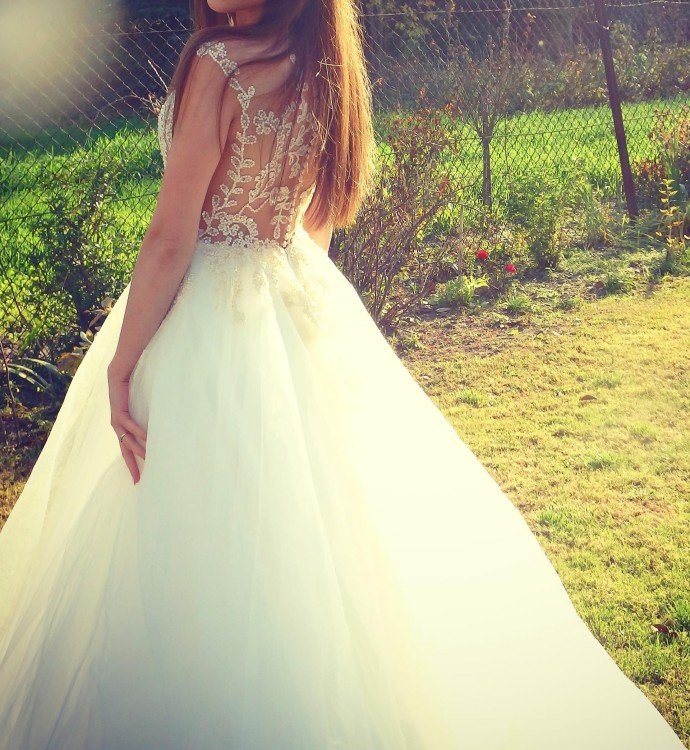 Sprzedam piękną suknie ślubną z kolekcji Catarina Kordas zakupioną we wrześniu w salonie Madonna. Kolor mleczny. Dopasowana góra w cienistym odcieniu, efektownie zdobiony tył (zapinany na guziczki), tiulowy dół, posiada podpinany tren. Suknia uszyta na 165 cm wzrostu plus obcas 8 cm, rozmiar 36. Praktyczna, a zarazem lekka. Suknia po ślubie został oddana do pralni.