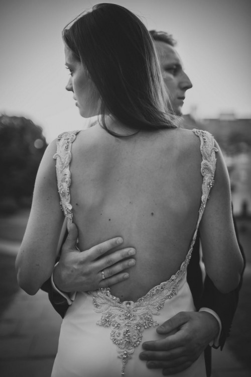Nowoczesna suknia w kolorze śmietankowej bieli. Wykonana z satyny i zwiewnego muślinu, lekka i wygodna, z podpinanym trenem. Ozdobiona oryginalnymi aplikacjami z koronki i kryształków, biegnącymi od ramion wzdłuż głęboko wyciętego dekoltu na plecach. Suknia w rozmiarze 36, wzrost 174 cm (plus 10cm obcas).