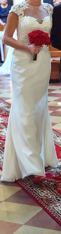 Piękna i zjawiskowa suknia ślubna ICON z kolekcji z 2017 roku, zakupiona w salonie firmowym w Gdyni. Suknia w kolorze ECRU lecz wygląda na pięknie białą :) Dekolt satynowy w serduszko. Plecy odkryte, gorset taliowany w całości z koronki gipiurowej bez świeceń. Suknia prosta, delikatnie rozkloszowana w całości z muślinu. Suknia z tyłu zapinana na zamek.
