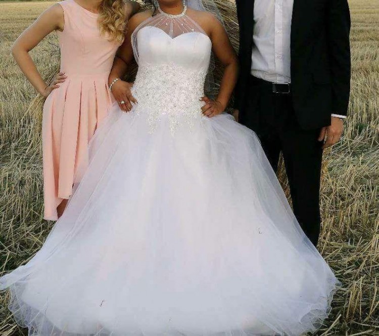 Piękna suknia typu Princessa śnieżnobiała z kryształkami swarovskiego dodatkowym atutem jest piękny naszyjnik który jest nieodłącznym elementem sukni gorset pokryty mnóstwem pięknych koralików swarovskiego. Rozmiar 38/40 krótki welon gratis (prana w pralni czeka na nową właścicielkę w oryginalnym opakowaniu z salonu) Suknia była szyta w jednym z warszawskich salonów kosztowała około 3000zł.