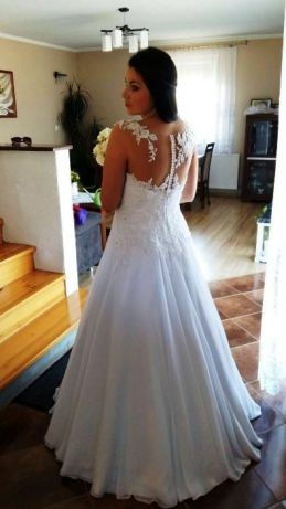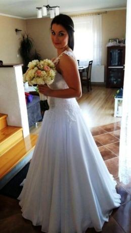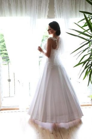 Sprzedam suknie ślubną! Góra z koronki na cielistej siateczce, której prawie nie widać, dół z muślinu. Rozmiar 38, szyta na wzrost 164 cm + 7 cm obcas, suknie można przedłużyć skracając nieco koło lub całkiem wyciągnąć koło (także świetnie się prezentuje). Można też bez problemu suknie skrócić; Tył zapinany na guziczki. Koło i welon w komplecie!