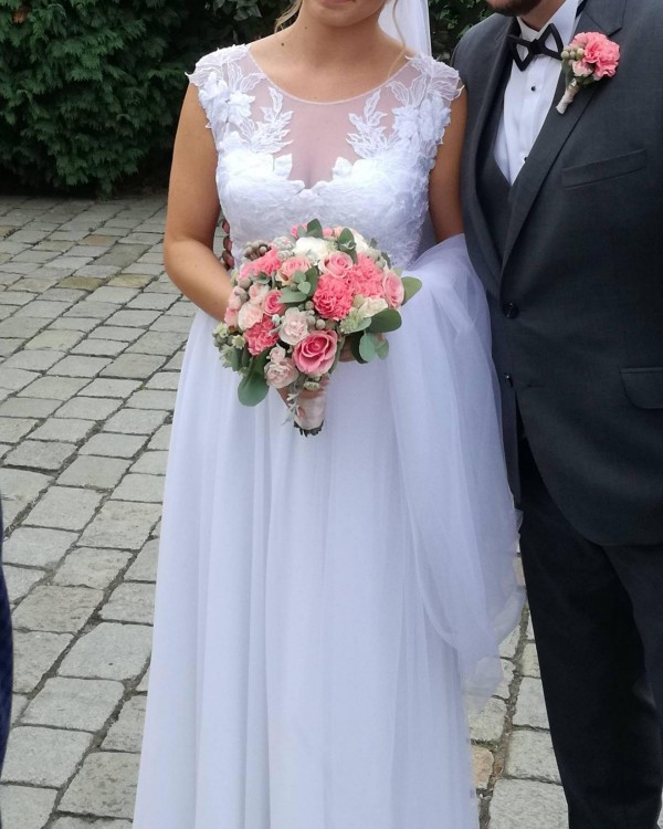 Suknia dla Pań w rozmiarze 38, szyta na 167 cm wzrostu + obcas 9 cm. Kolor biały. Góra koronkowa z drobnymi elementami połyskującymi. Dekolt pokryty siateczką. Plecy odkryte w kształcie litery V. Suknia z podpinanym trenem, zapinana z tyłu na trzy guziki. Dół dwuwarstwowy, ale mimo to lekki, zwiewny i pięknie układający się w tańcu.