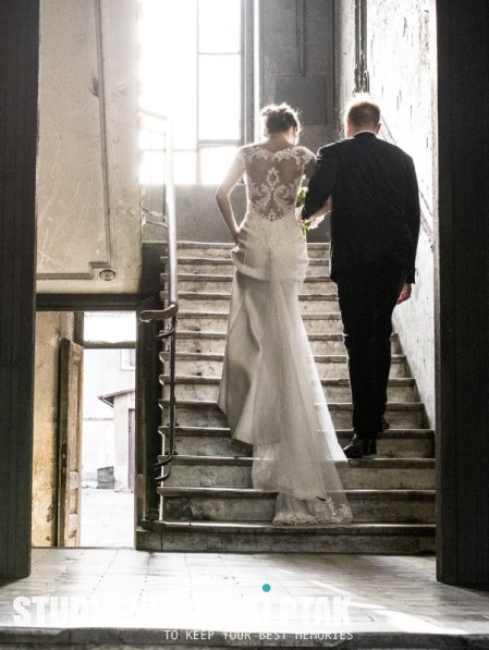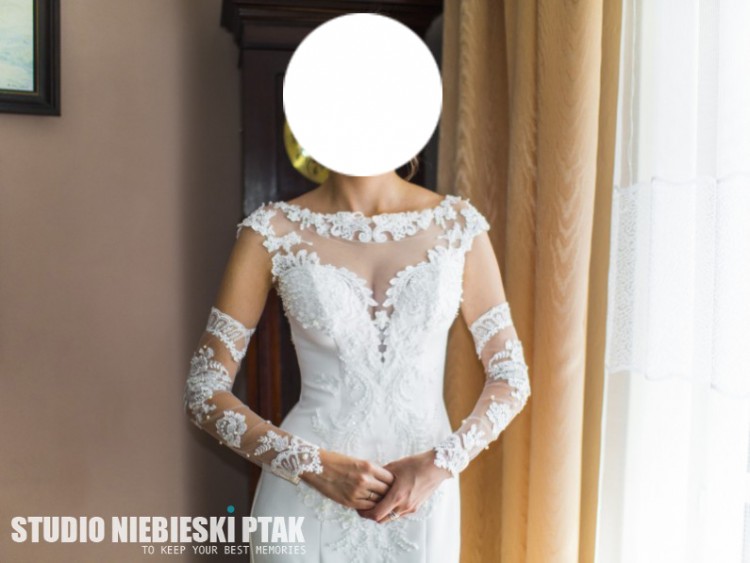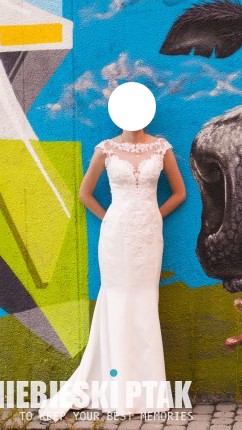 Posiada delikatny tren, zapinany na niewidoczny guzik i duży, odpinany tren wykończony hiszpańską koronką i delikatnymi kamyczkami.