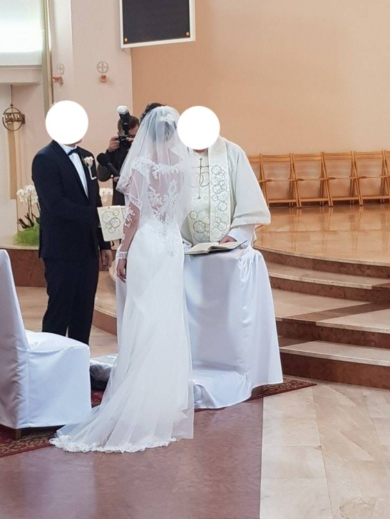 Suknia ślubna w rozmiarze 36/38 i w odcieniu iviory. Posiada dwa treny - jeden mały, podpinany na guziczek i duży, odpinany.